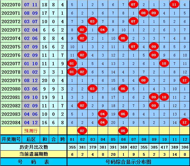 后区分析:后区上期开出1路+0路奖号04和12,最近20期后区0路奖号开出16个,1路奖号出现13个,2路奖号出现11个,最近8期前区0路奖号出现7个,1路奖号出现6个,2路奖号出现3个,本期后区注意号码:01、02、06、09、10,单挑两码组合02+06。