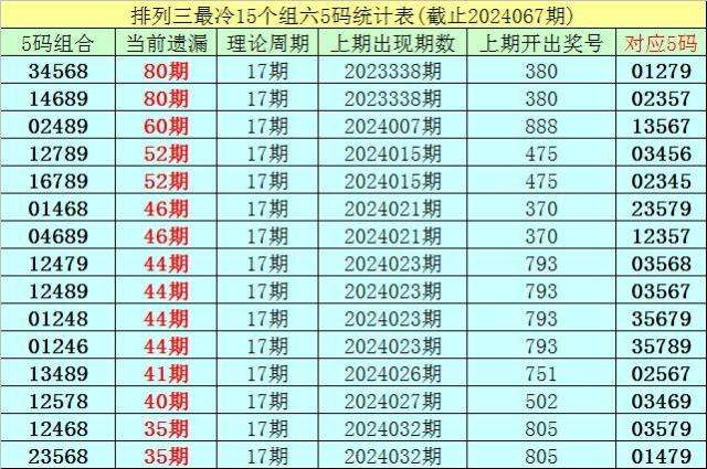 (4)排列三第2024067期遗漏值最大的十个5码组六组合解冻了0个;