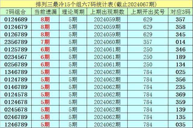 (1)在排列三已开出的6839期奖号中(统计截止第2024067期),目前7码组六遗漏值最大的组合为:0124689、0124679、0126789,本期遗漏8期;