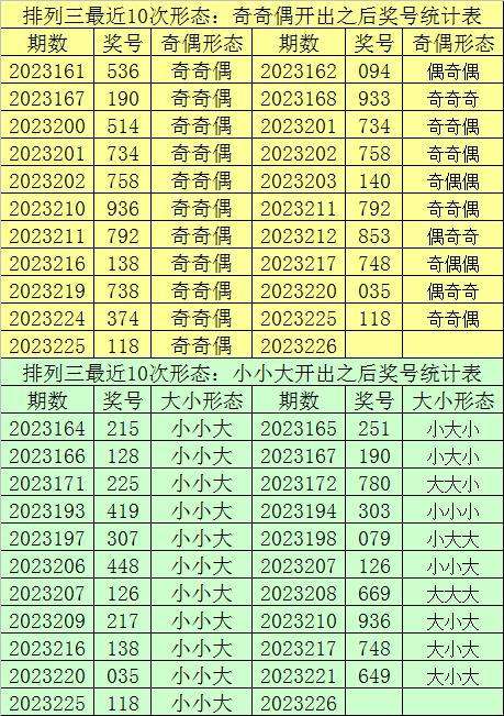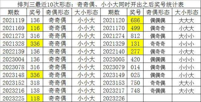 排列三最近10次同时开出奇偶形态:奇奇偶和大小形态:小小大时其奖号分别为:136-116-316-336-136-136-316-336-318-138-118,下期分别开出号码为:686-499-812-131-277-420-014-025-750-748,详细统计见下表:
