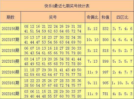 福彩快乐8第2023162期开出奖号:03 06 11 15 21 28 29 30 33 37 39 40 44 48 55 57 60 70 75 80,其中奖号奇偶比为11:9,和值为781,四区比为4:8:5:3。