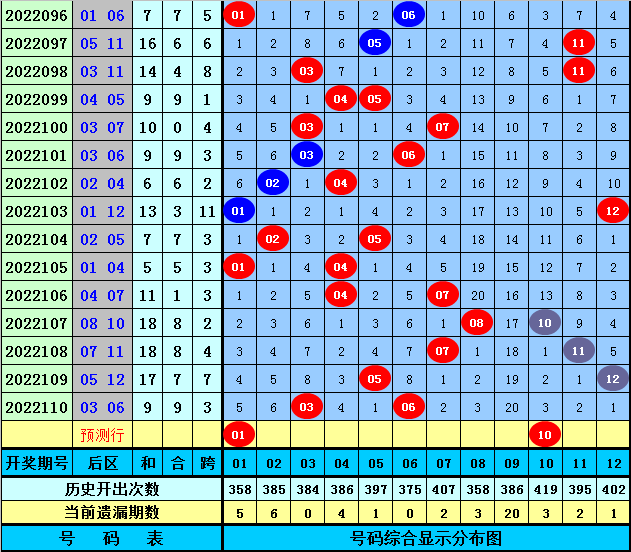 后区分析:在第111期历史同期开奖中,后区奖号奇偶比为12:16,最近5年同期后区奇偶走势为:全偶、一奇一偶、全偶、一奇一偶、一奇一偶,今年同期看好再出一奇一偶组合,关注号码01、10。