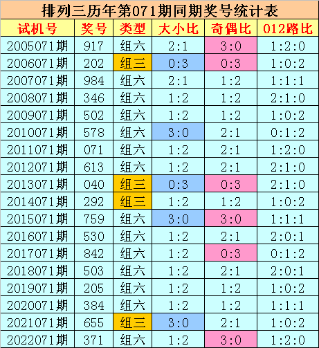 012路分析:历史上排列三第071期同期奖号中,012路奖号总个数比为21:14:19,012路奖号轮空期数比为2:7:6,今年第071期预计012路号码平衡出现,关注012路比1:1:1。