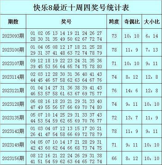 福彩快乐8第2023156期开奖回顾:08 12 16 21 22 24 26 29 31 38 41 51 54 59 62 63 64 65 72 74,其中奖号奇偶比为8:12,大小比为10:10,012路比为7:4:9,首尾间距为66。