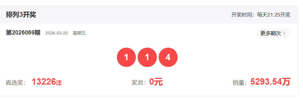 体彩排列3第2026069开奖号码114,形态为组三,奇偶比2:1,和值6,跨度3,大小比0:3,【012】路个数比0:3:0。