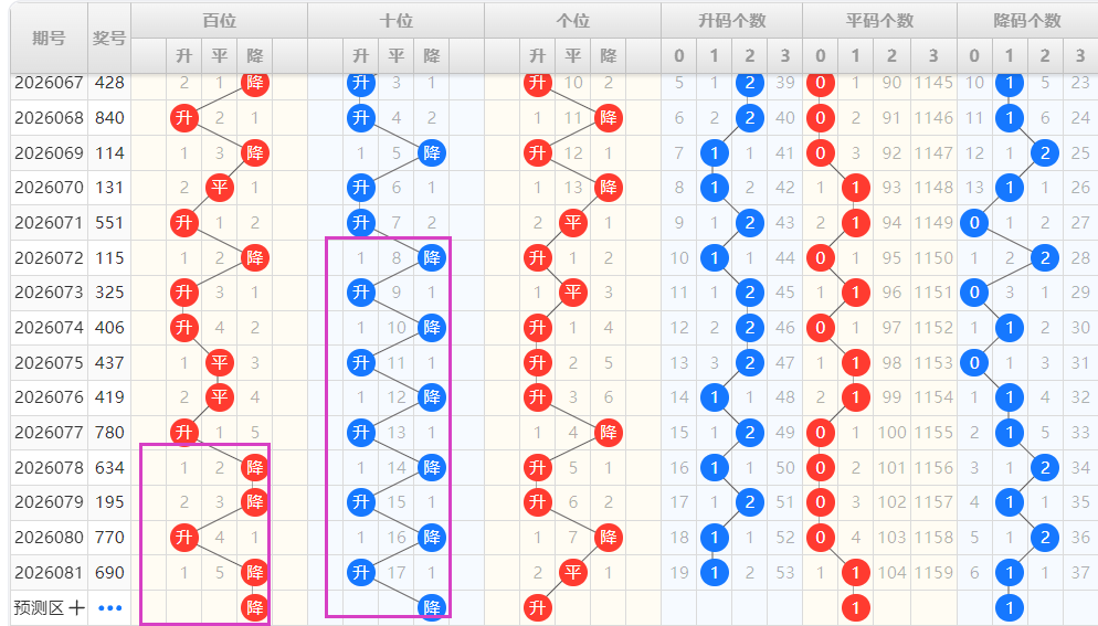 【排列3个位】:近期升降走势为:升-升-升-降-升-升-降-平,为一种交错走势,结合走势图可以看出,图中紫色框圈出为一种M形态的出球方式,本期可以重点看好升的形态号码的开出。