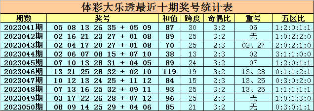 上期开奖:大乐透第2023050期奖号为:08 09 14 25 29 + 04 06,前区号码和值为85,跨度为21,奇偶比为3:2,无重号,五区比为0:3:0:1:1。
