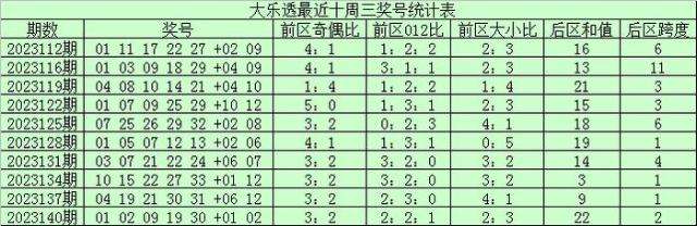 前区奇偶走势:上期前区奇偶比为3:2,上周三前区奇偶比3:2,最近十周三奇数号码表现占优,本期看好奇数号码继续走热,推荐奇偶比3:2。