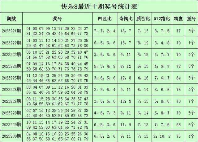 福彩快乐8第2023230期开奖回顾:04 08 10 13 16 20 23 25 26 30 36 37 50 58 61 65 67 68 71 79,其中奖号四区比为6:6:2:6,奇偶比为9:11,质合比为7:13,跨度为75,012路比为2:10:8,开出4个重号:10、13、65、71。