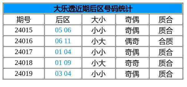 后区分析:上期后区开出03 04,小小、奇偶、质合形态。近5期大小比2:8、奇偶比6:4、质合比5:5,小数、奇数占比较高,本期重点关注后区开出小小、奇奇、质质,双胆03 05。