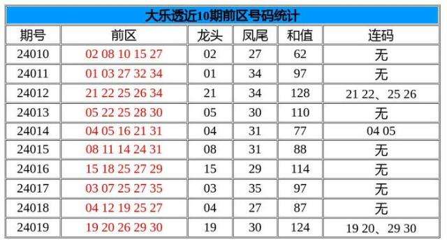 体彩大乐透第24019期奖号开出:19 20 26 29 30 + 03 04,当期龙头19,凤尾30,连码19 20、29 30,和值124。