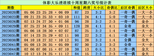 后区分析:最近10周星期六后区号码奇偶比为11:9,奇偶号码走势基本持平,号码大小比为13:7,大号相对活跃,本期后区精选两码08和10。