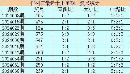 排列三十周星期一分别开出奖号:239、250、221、760、514、547、575、124、475、405,其中号码奇偶比为16:14,奇偶号码出现比例相当;号码大小比为13:17,大小号码开出个数相当;号码012路比为6:12:12,0路号码走冷。