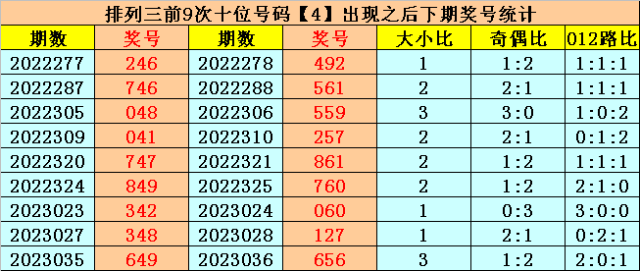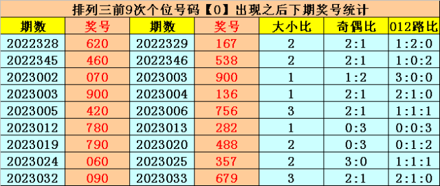 个位号码:上期奖号为小号、偶数、0路号码:0,历史上个位号码0共开出608期,前一次出现在第2023032期,上期遗漏18期再出。