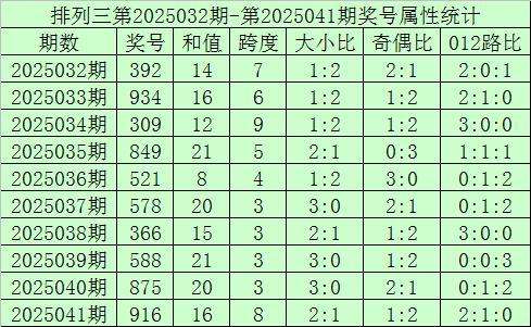 上期回顾:排列三第2025041期开奖号:916,奖号和值:16,奇偶比1:2,大小比2:1。
