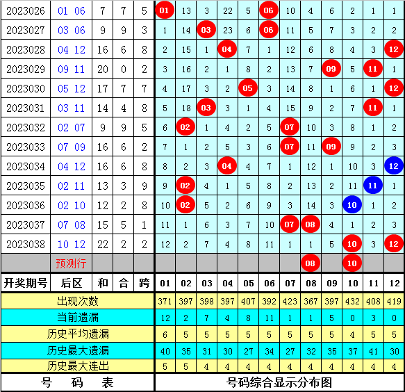 5、后区分析:上期后区奖号为:10和12,开出大大组合和偶偶组合,本期看好大号走热,预计偶数走热,参考两码10、08。