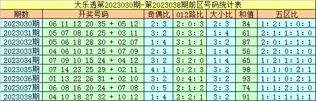 上期回顾:大乐透第2023038期奖号为:04 10 18 27 32 + 10 12,其中前区奇偶比1:4,012路比2:2:1,大小比3:2,和值91,五区比1:1:1:1:1。