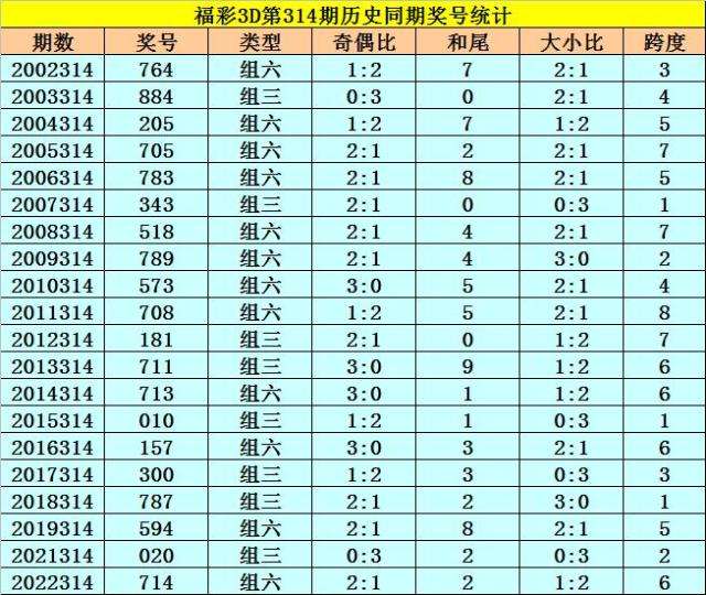 福彩3D历年第314期同期奖号为:764 884 205 705 783 343 518 789 573 708 181 711 713 010 157 300 787 594 020 714。
