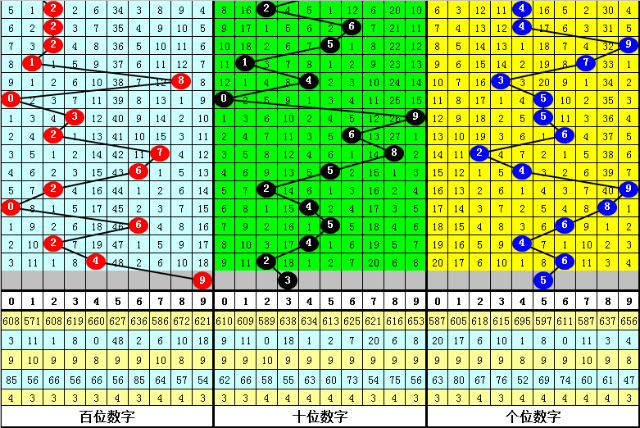 百位走势:近10期在0-7之间出号,跨度为8点,出号比较分散,上期奖号为4,上升2点,本期看好该位上升。另外近10期该位大小比为3:7,大号较冷,本期注意大号回补,关注号码9。