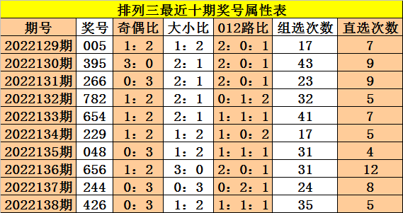 上期回顾:体彩排列三第2022138期奖号:426。,奇偶比0:3,大小比1:2,012比1:1:1。