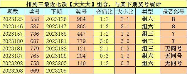 开奖回顾:排列三第2023208期开奖号码为:669。奖号类型为:组三,大小类型为:大大大,奇偶类型为:偶偶奇,包含重号:6。