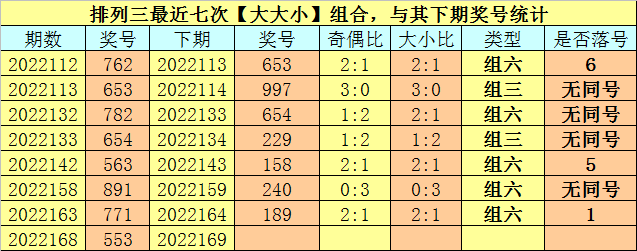 大小分析:排列三上期开出号码553,大小类型为【大大小】,最近七次开出大小类型大大小的奖号分别为:762、653、782、654、563、891、771,其下期分别开出号码:653、997、654、229、158、240、189。其中号码大小比为12:9,大小号码出现次数基本相当,本期注意大号转热,看好出现2个大号。