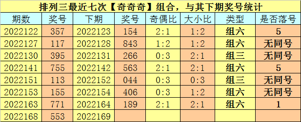 奇偶分析:排列三上期奖号为553,其奇偶类型为【奇奇奇】,最近七次出现奇偶类型奇奇奇的号码分别为:357、117、395、755、113、155、771,其下期奖号分别为:357、117、395、755、113、155、771。其中号码奇偶比为7:14,奇数奖号开出比例较低,本期注意奇数回补的可能,关注奇偶比2:1。