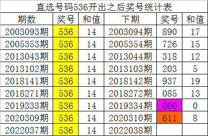 福彩3D第2022037期开出直选号码为:536,该直选号码历史上出现了9次,其下期分别开出了号码:890、726、318、203、937、085、000、611,如图: