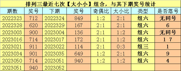 大小分析:排列三上期开出号码940,大小类型为【大小小】,最近七次开出大小类型大小小的奖号分别为:712、620、900、714、911、901、714,其下期分别开出号码:849、167、136、172、114、649、940。其中号码大小比为9:12,大小号码出现次数基本相当,本期注意大号转热,看好出现2个大号。
