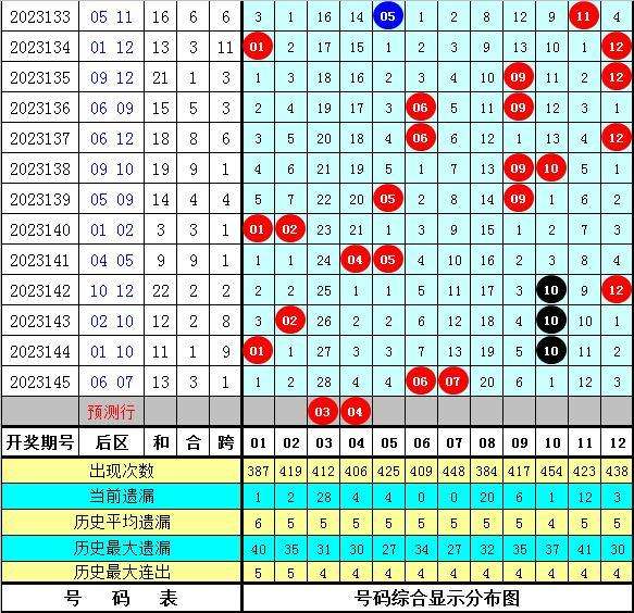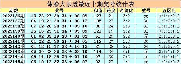 上期开奖:大乐透第2023145期奖号为:06 10 12 32 33 + 06 07,前区号码和值为93,跨度为27,奇偶比为1:4,无重号,五区比为1:2:0:0:2。