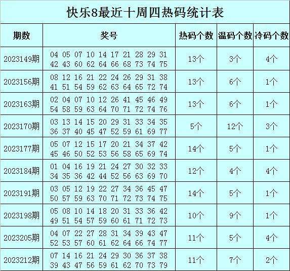 福彩快乐8第2023212期(上周四)开奖回顾:07 14 16 21 24 29 30 36 37 38 39 43 47 56 59 61 62 70 73 79,其中奖号遗漏总值为46,冷温热码比为2:7:11。