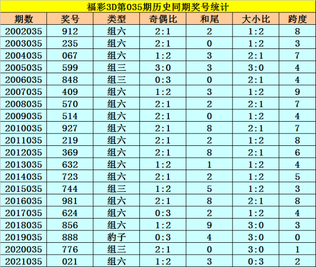福彩3D历年第035期同期奖号为:912 235 067 599 848 409 570 514 927 219 369 632 723 744 981 624 856 888 776 021。