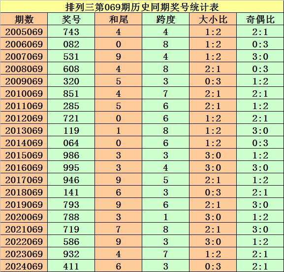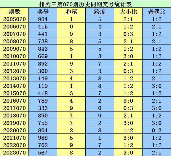 从2004年至今排列三已开出6841期奖号了,本期为排列三2024年第070期开奖,历史同期已出现19次奖号: