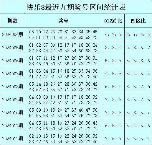 福彩快乐8第2024012期开出奖号:02 10 13 15 19 22 24 26 30 32 33 42 46 53 54 58 62 72 77 80,其中奖号012路比为7:6:7,四区比为5:6:5:5。