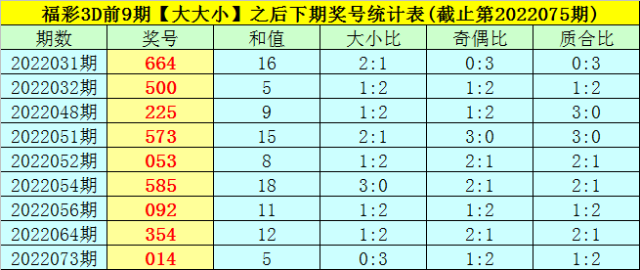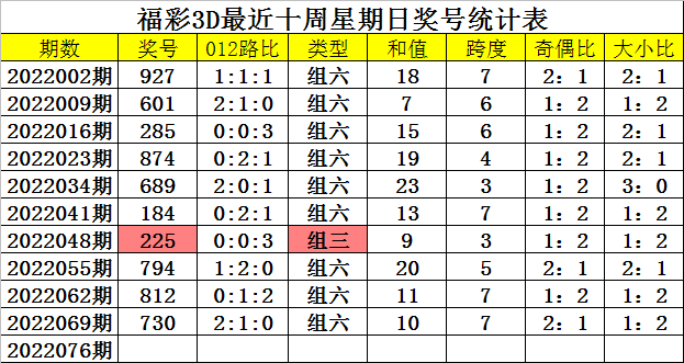 一、上期回顾:福彩3D第2022075期奖号为:660,奖号类型开出组三,大小比为2:1,奇偶比为0:3,和值为12,跨度为6,012路比为3:0:0。
