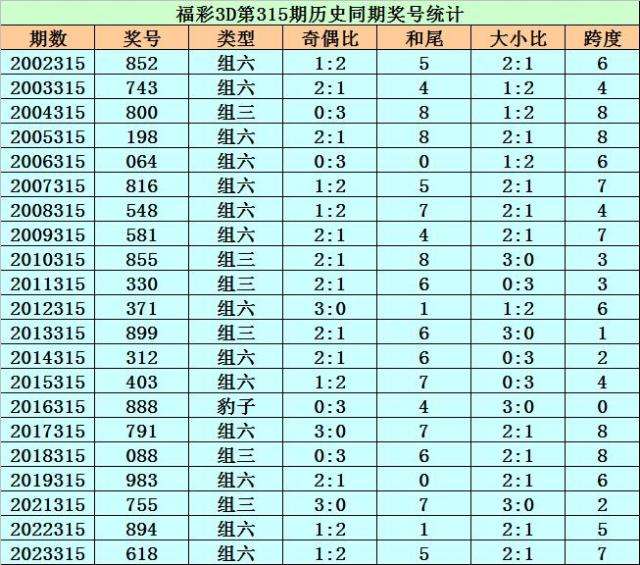 福彩3D历年第315期同期奖号为:852 743 800 198 064 816 548 581 855 330 371 899 312 403 888 791 088 983 755 894 618。