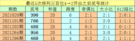 1、排列三最近两期百位号码分别开出4和2,历史上百位号码连续两期分别开出4和2的奖号出现了74期。前五期开出之后其下期奖号分别为:398、786、488、956、468;
