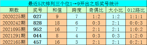 1、排列三前两期个位分别开出号码1和9,历史上个位号码连续两期分别出现1和9时,共有65次。在最近5次出现时,其下期分别出现号码:027、828、952、044、457;
