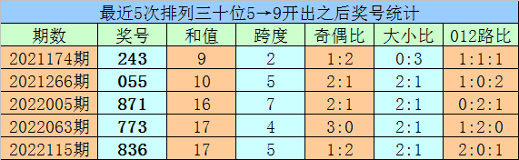 1、最近两期排列三十位号码开出号码分别为5和9,历史上十位号码连续两期同时出现号码5和9的奖号共开出69期。最近五次下期开出号码为:243、055、871、773、836;