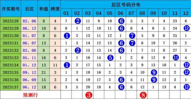 上期开出后区号码:06 12,偶偶组合。十期内出现4次偶偶组合,2次奇奇组合,2次奇偶组合,2次偶奇组合,奇偶组合较冷,根据图表分析,本期预测奇偶组合开出,本期预测号码:03 04 06 08 10。精准推荐:03 08。
