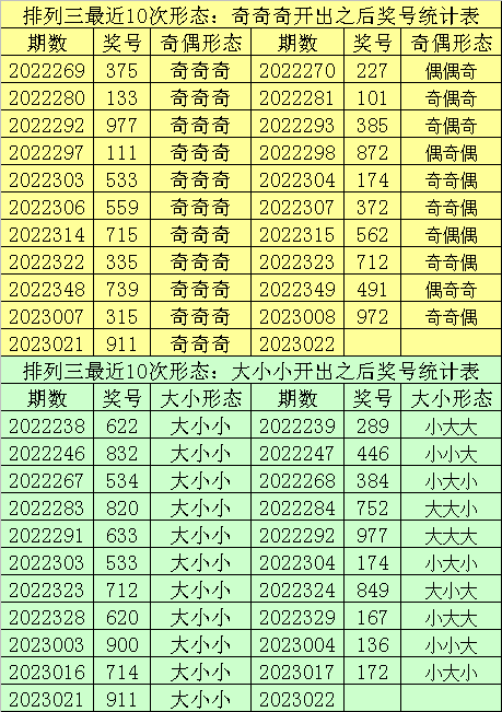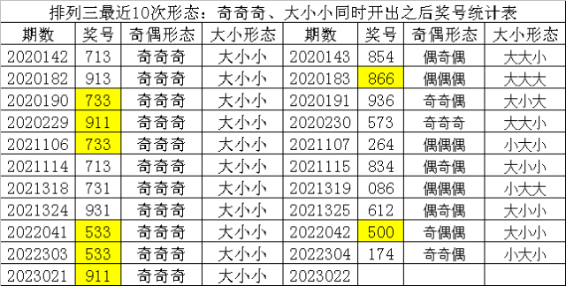 排列三最近10次同时开出奇偶形态:奇奇奇和大小形态:大小小时其奖号分别为:713-913-733-911-733-713-731-931-533-533-911,下期分别开出号码为:854-866-936-573-264-834-086-612-500-174,详细统计见下表: