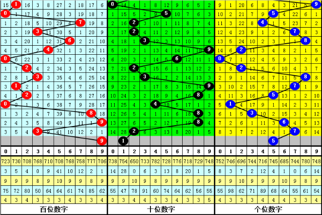 百位上期出现:热号3,该位连续十期以热号出现较多,以温号出现较少,目前百位热号有6个:0、1、2、3、8、9,本期看好开出热号再次出现,参考号码9。