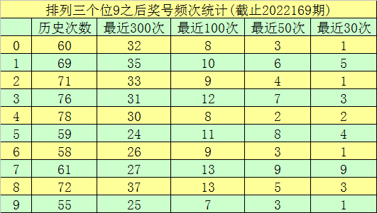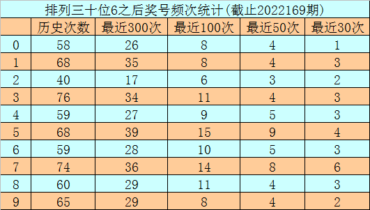 第三位杀号:第三位上期出现奖号9,该位历史上奖号9已开出了660次,最近100次第三位开出9时,下期号码0-9分别落号:号码7、8→13次,3→12次,5→11次,1→10次,2、6→9次,0、4→8次,9→7次。