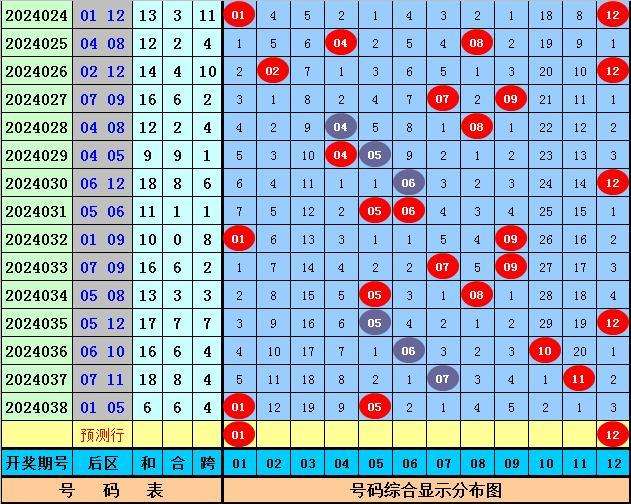 后区分析:上期该位开出奖号01和05,和值为6,跨度为4,后区前4次开出和值6和跨度4时,其下期奖号分别为:03+04、03+05、01+10、08+12,号码奇偶比为4:4,大小比为3:5,012路比为3:3:2,本期后区号码参考01、05、09、11、12,精选两码01、12。