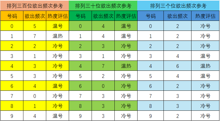 012路分析:上期012路比为1:2:0,1路号码表现活跃,2路号码弱势。从冷热号分布看,0路号码(0,3,6,9)回补空间较大,其中号码3遗漏13期。本期推荐关注1:1:1或2:0:1的余数比。