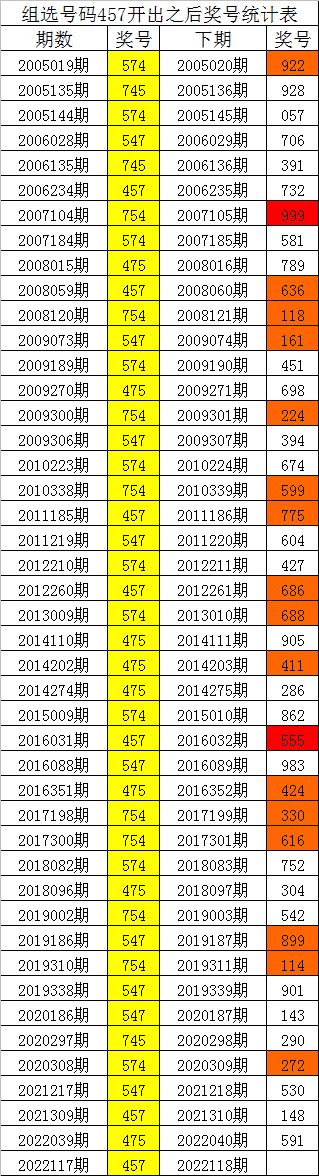 从上表统计可以看出,直选号码457开出之后,其下期奖号: