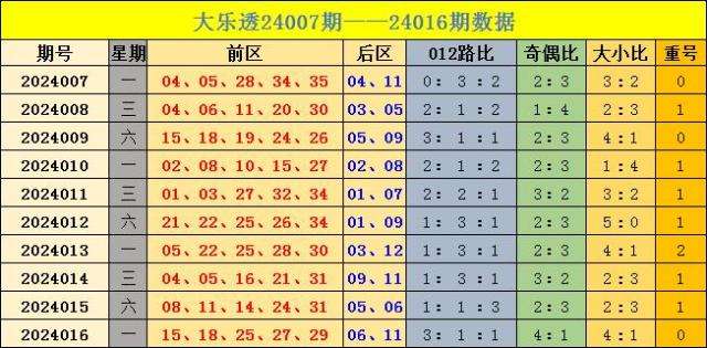 大乐透第2024016期开奖号码:15 18 25 27 29+06 11。前区号码大小比为4:1,012路比为3:1:1,奇偶比为4:1,开出0枚重号。