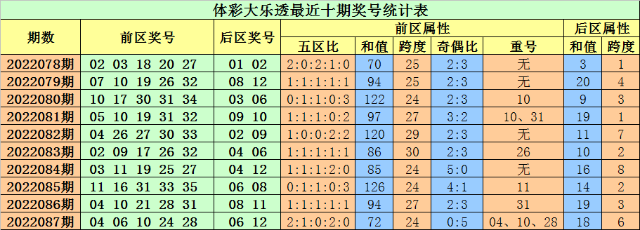 上期开奖:体彩大乐透第2022087期开奖号码为:04、06、10、24、28+06、12。前区五区比为2:1:0:2:0,和值为72,首尾间距为24,奇偶比为0:5,开出3个重号:04 10 28。后区号码和值为18,跨度为6。
