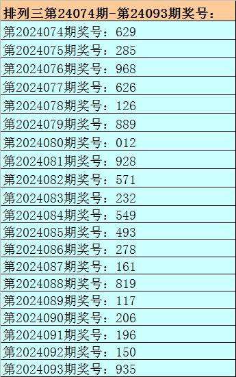 1。排列三最近十期分别开出号码:549-493-278-161-819-117-206-196-150-935,其中有6期奖号开出了上期的重复号码,本期预计第2024093期奖号:935中有重号,参考号码:3。