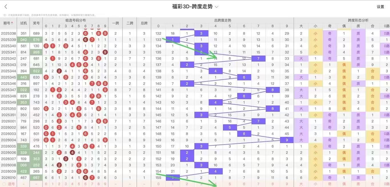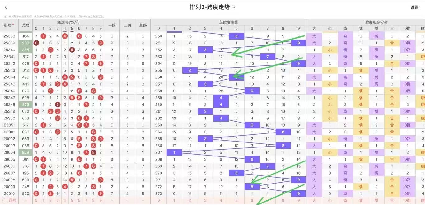10期内跨度走势为:3-8-9-1-6-7-5-9-6-9,10期内大小跨比为8:2,奇偶跨比5:5,百期内跨度9共开出9次,下期数据:7 5 5 5 1 6 3 2 6 近期度较热,考虑跨度9开出后容易出大跨度,近期大小规律下大:偶:合,所以接下来继续大跨,偶跨度表现!